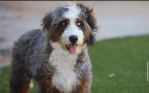 Tango is a son of our most famous cross, June + Cardiff. June and Cardiff have produced many service and therapy dogs for our clients. Tango is calm all the time. He has the most beautiful, rich, non fading color. Tango is a large mini / small standard Bernedoodle at just under 50
