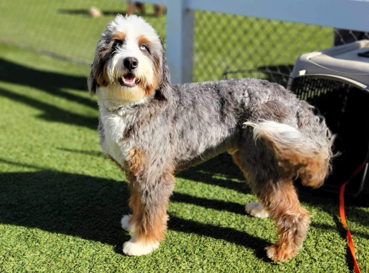 Tango is a son of our most famous cross, June + Cardiff. June and Cardiff have produced many service and therapy dogs for our clients. Tango is calm all the time. He has the most beautiful, rich, non fading color. Tango is a large mini / small standard Bernedoodle at just under 50