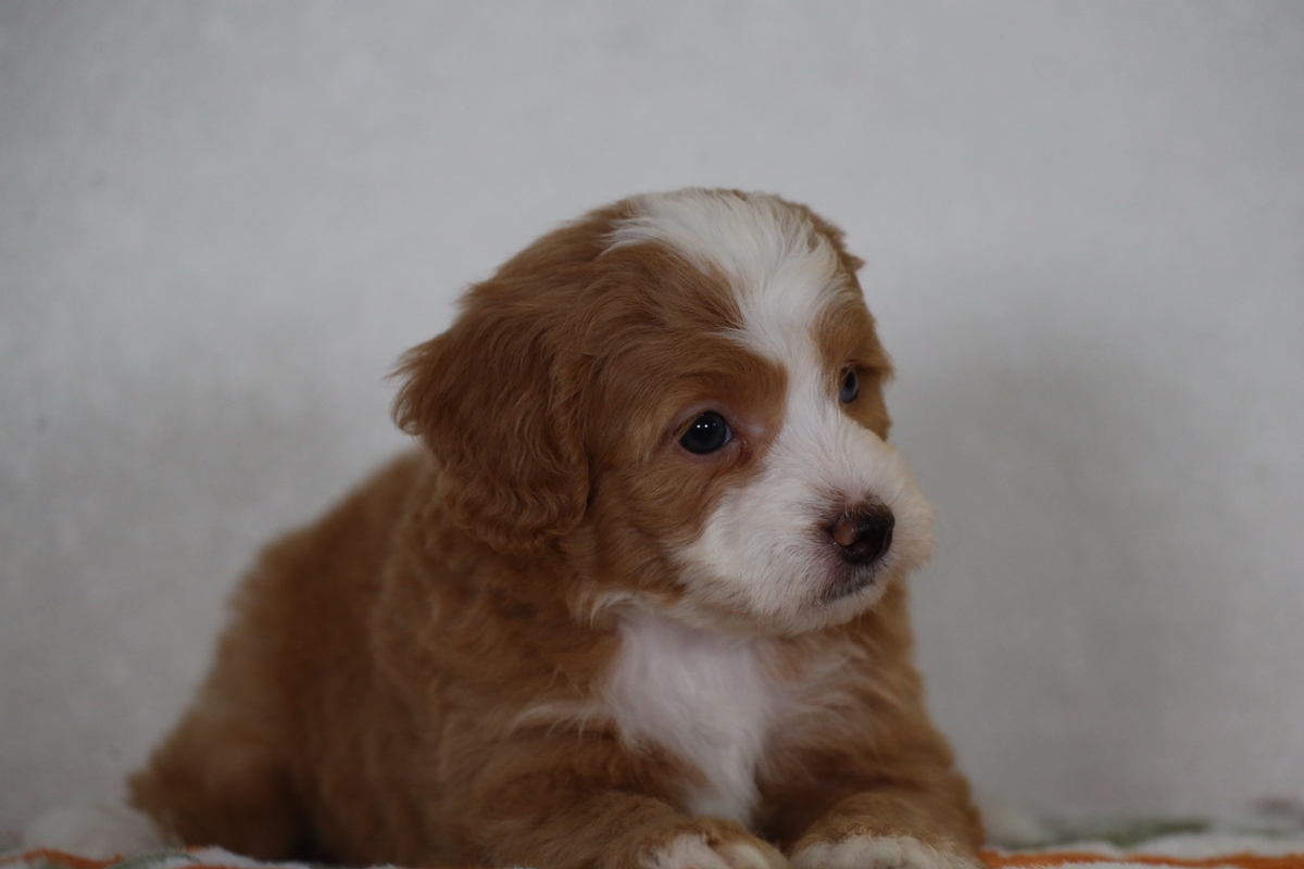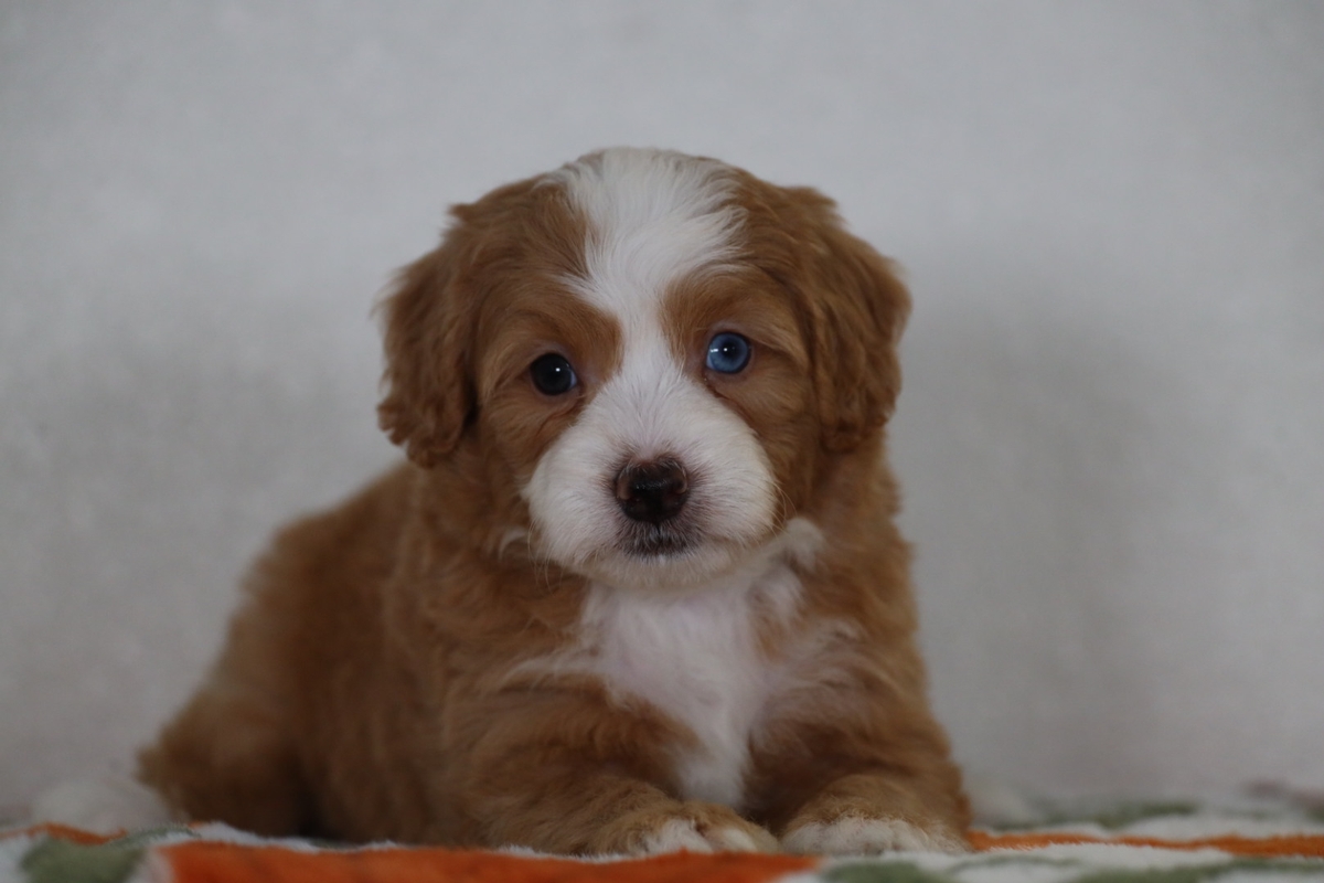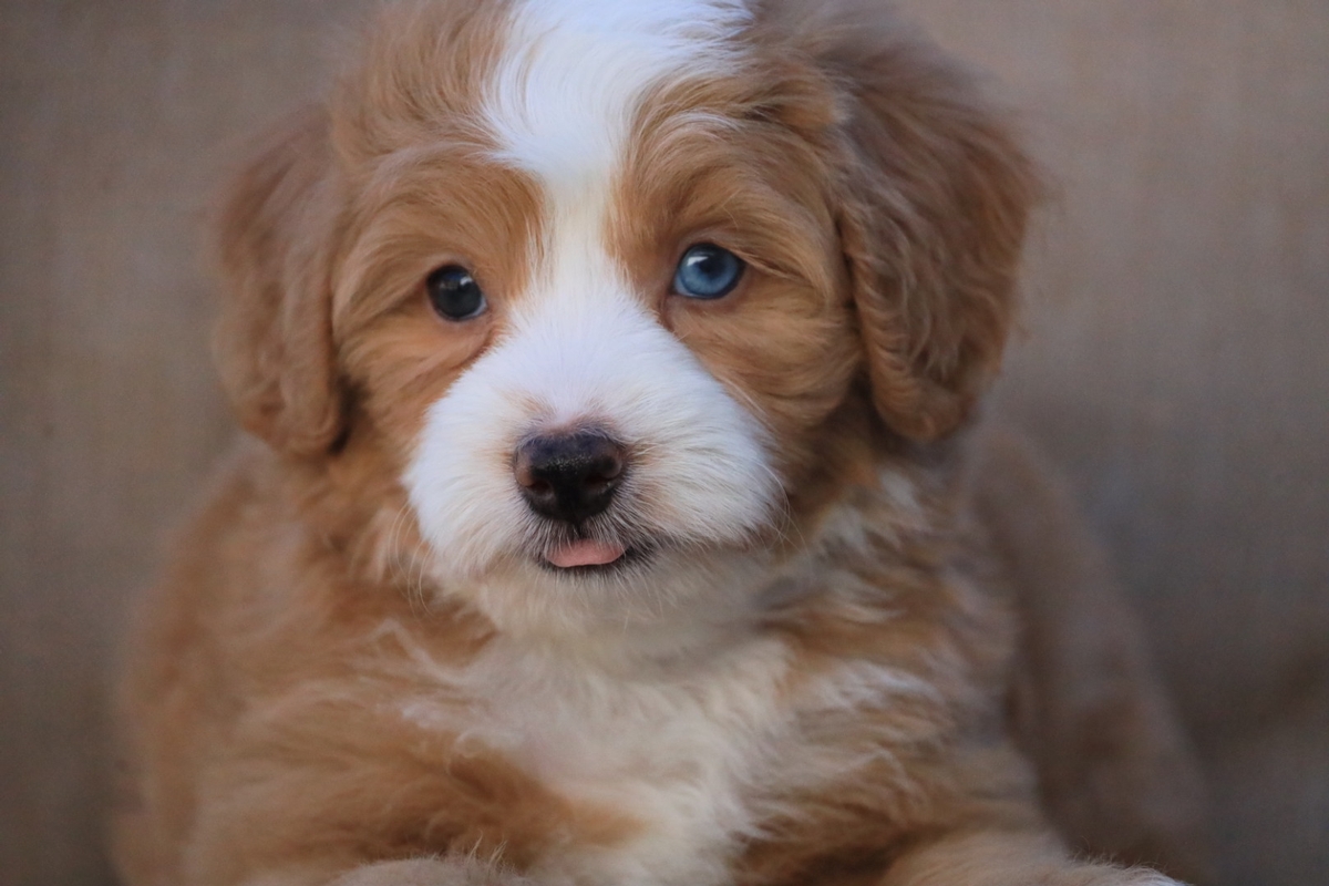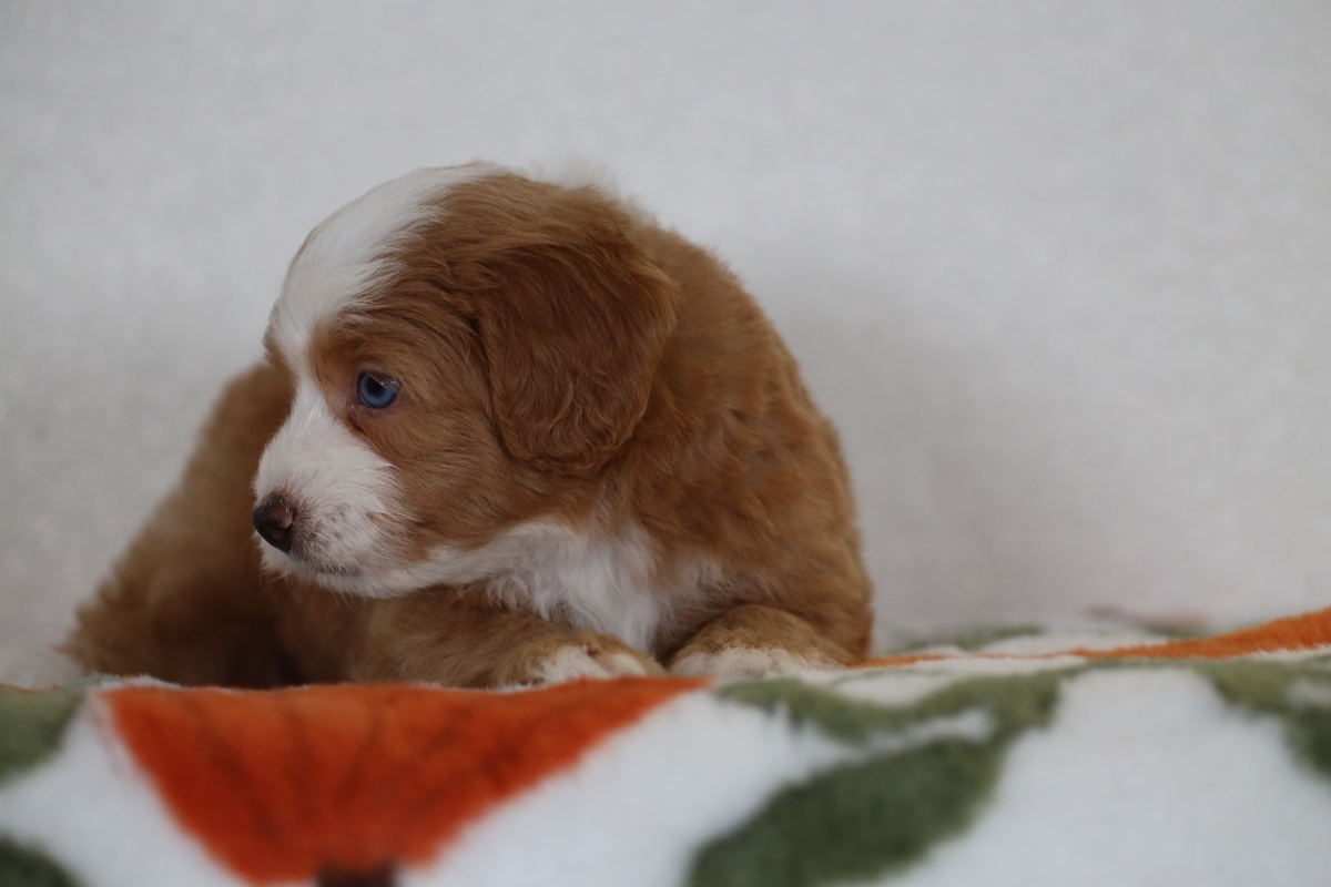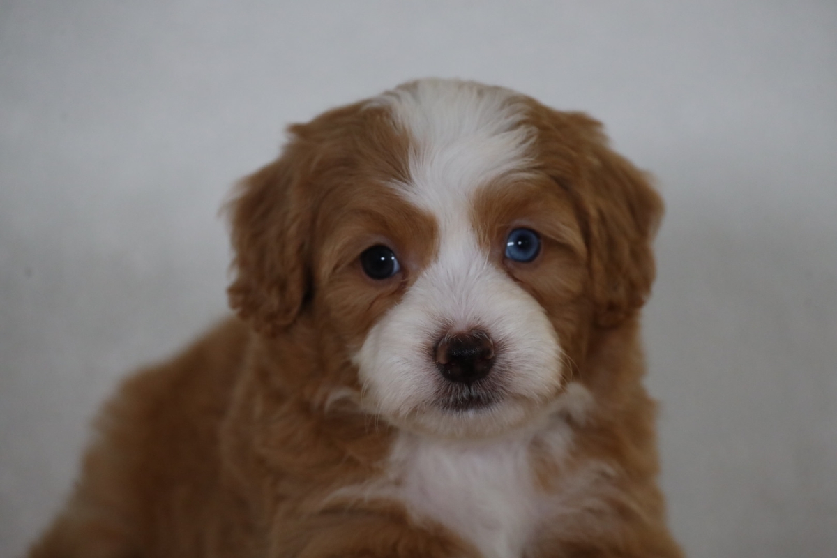 Meet Bounce, our stunning red and white tuxedo Mini Bernedoodle boy with the most eye-catching feature—a striking blue eye that gives him a one-of-a-kind look. His loose, wavy, fully furnished coat is non-shedding and hypoallergenic, making him an ideal companion for families or individuals wanting a gorgeous, low-maintenance pup. Bounce has the sweetest expression, a confident little trot, and a joyful presence that truly matches his name.