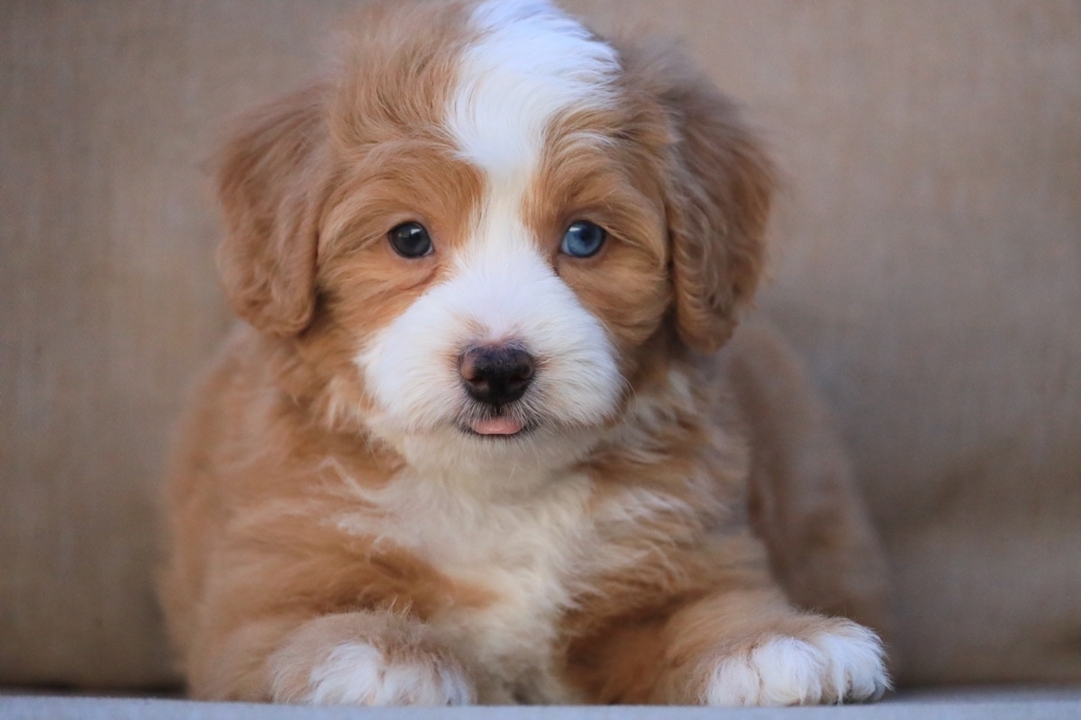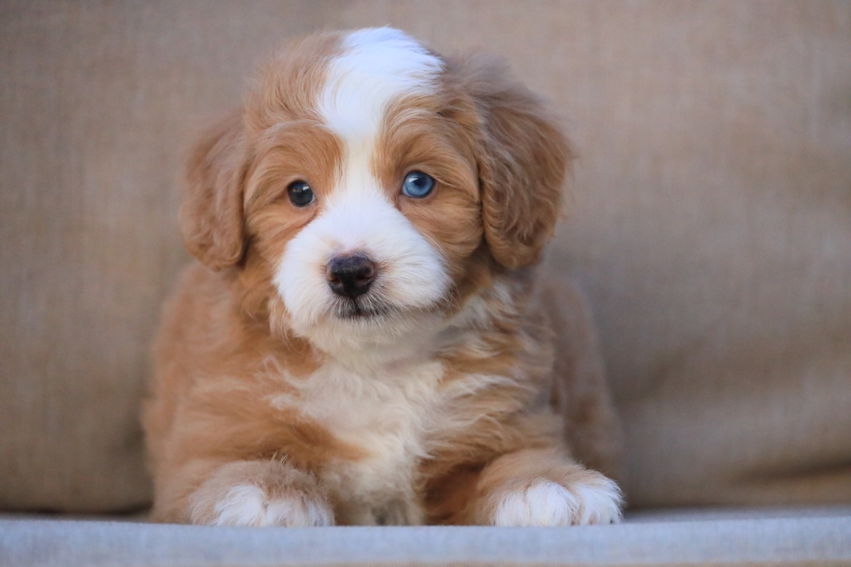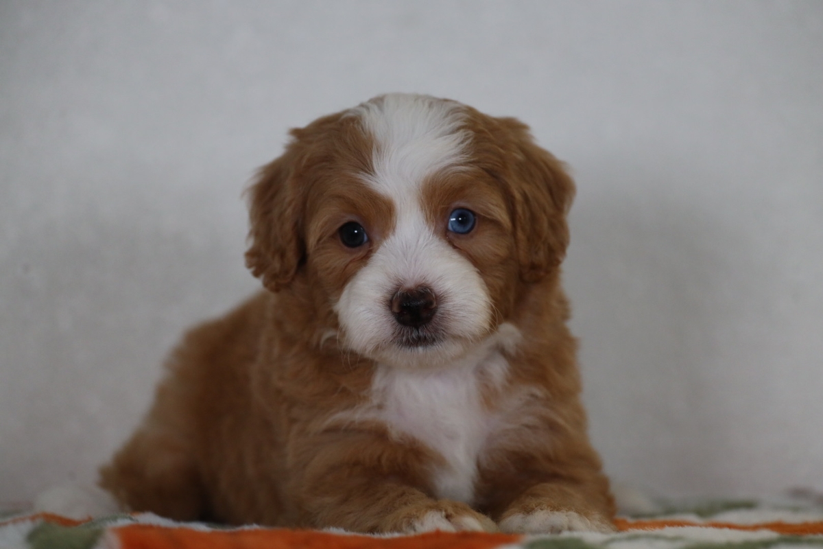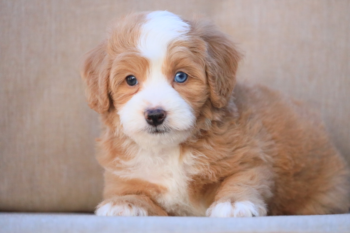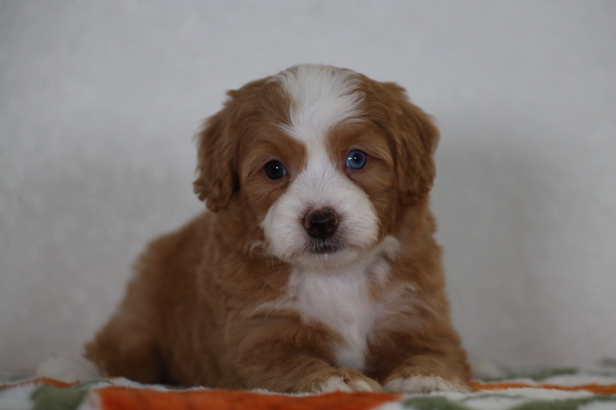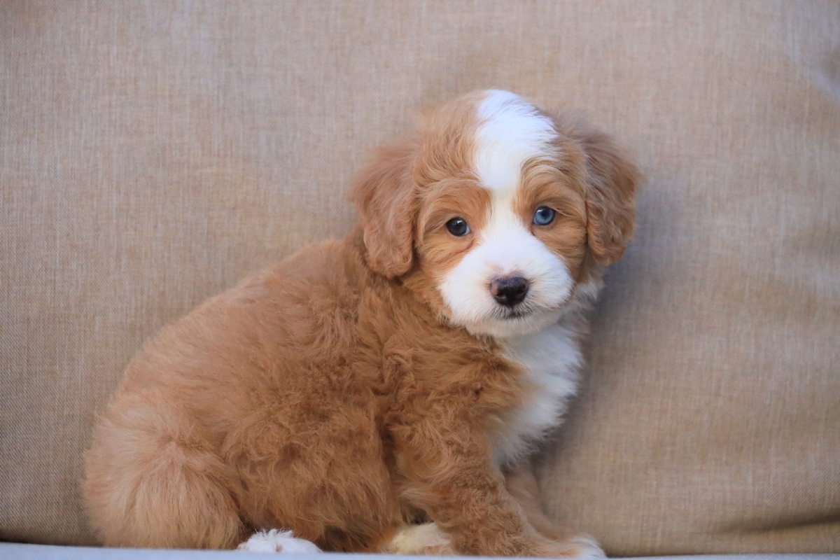Meet Bounce, our stunning red and white tuxedo Mini Bernedoodle boy with the most eye-catching feature—a striking blue eye that gives him a one-of-a-kind look. His loose, wavy, fully furnished coat is non-shedding and hypoallergenic, making him an ideal companion for families or individuals wanting a gorgeous, low-maintenance pup. Bounce has the sweetest expression, a confident little trot, and a joyful presence that truly matches his name.