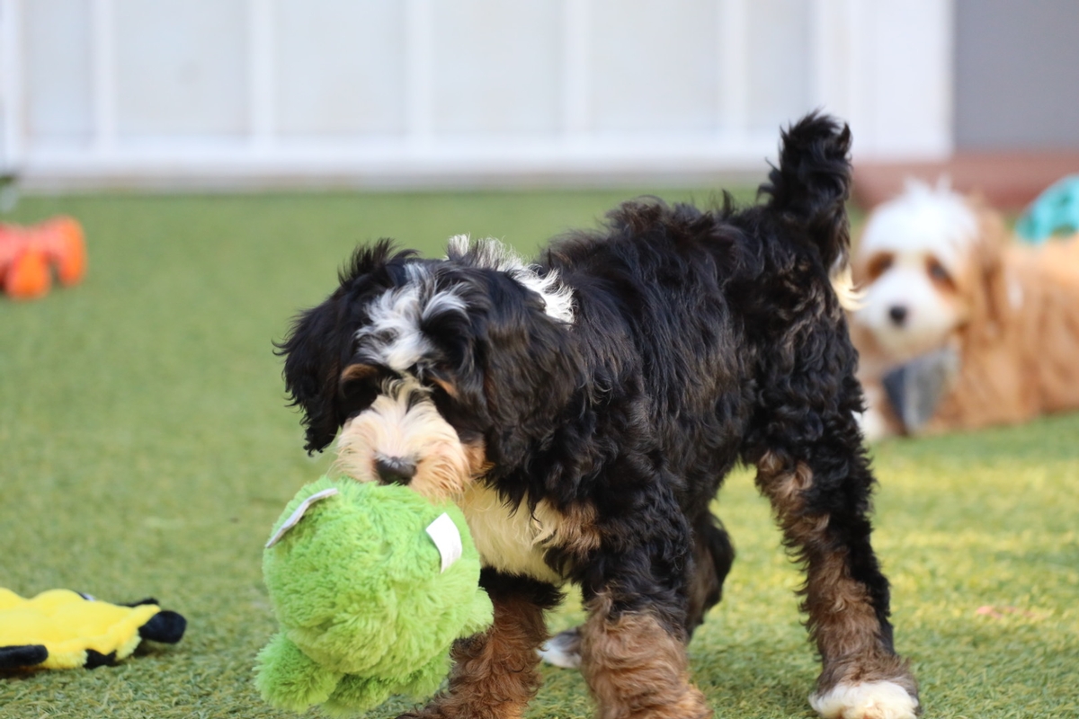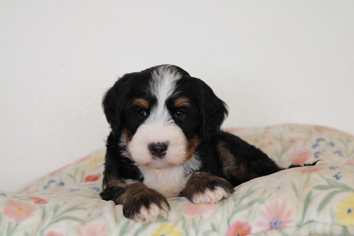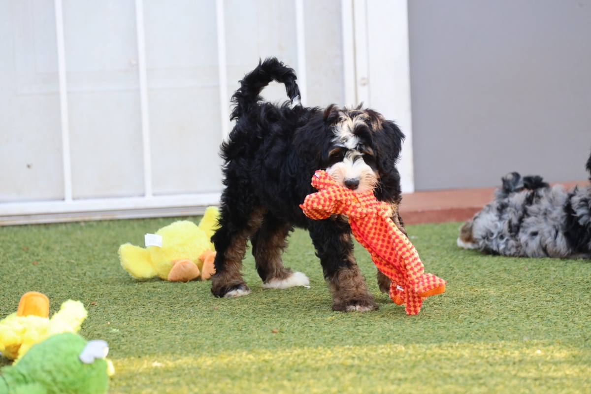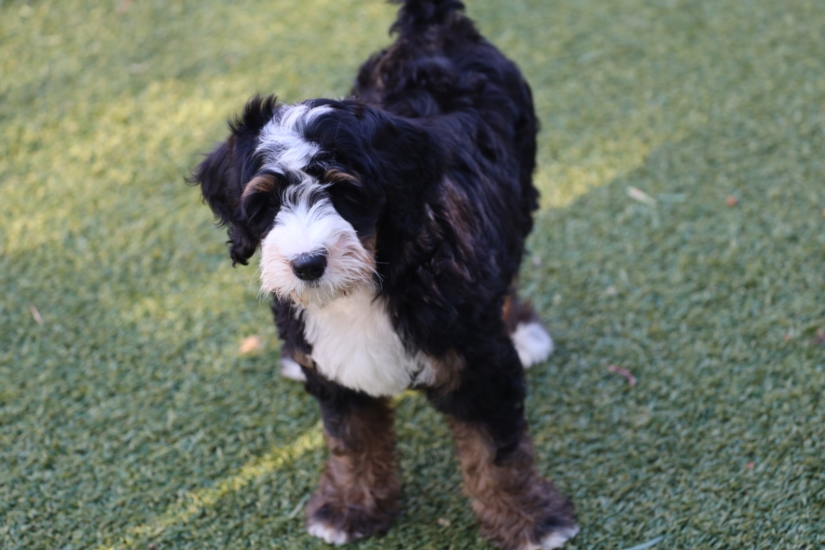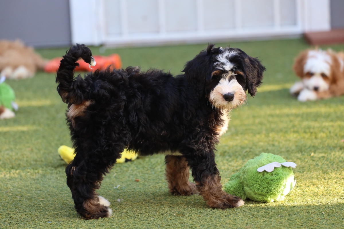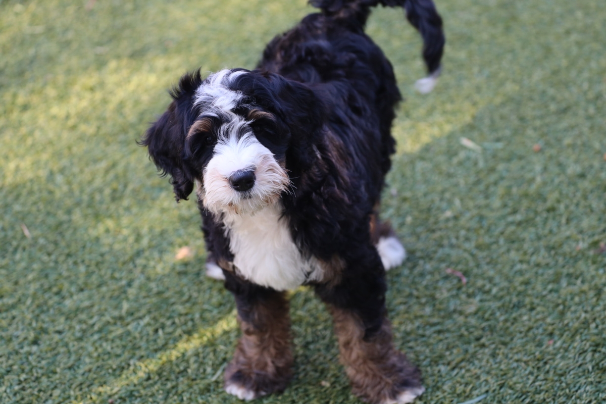 Meet Champ, our striking black tri-color male multigenerational Bernedoodle. Born on July 12th, Champ is now ready to head home with his forever family. With his classic tri markings, loose wavy coat, and balanced build, he’s as handsome as he is lovable. Expected to mature in the 40 lb range, Champ is a great medium size—big enough for adventures, but still the perfect snuggle companion at home.