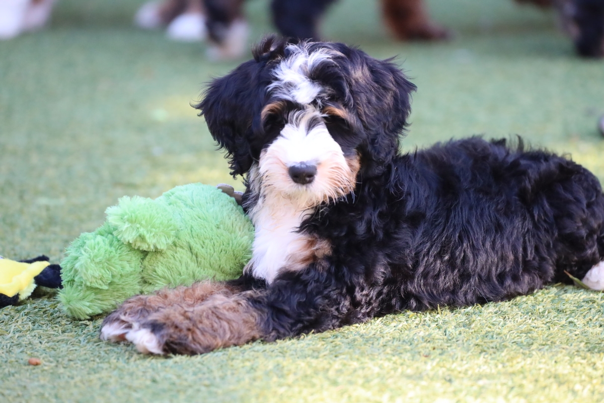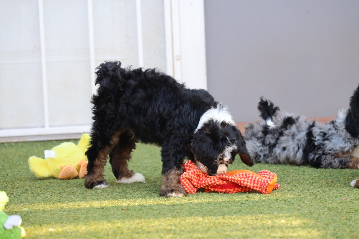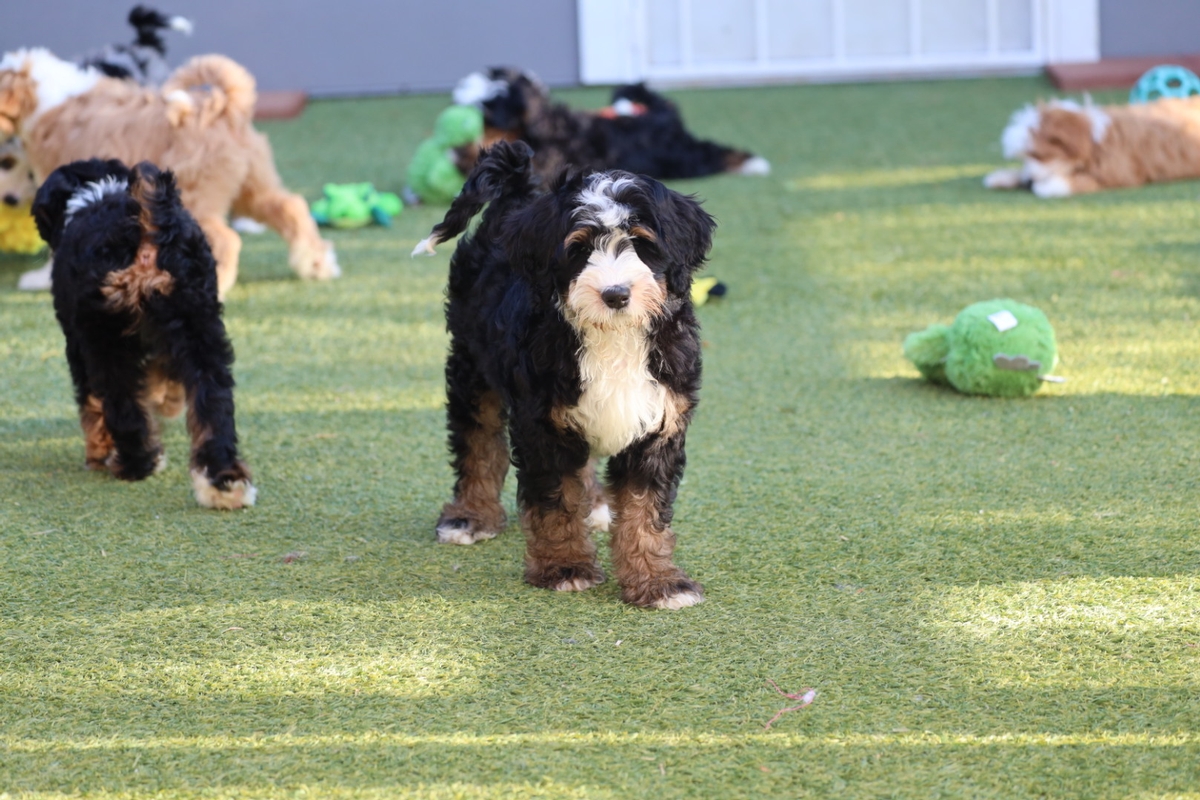 Champ’s coat is non-shedding and hypoallergenic, making him a wonderful choice for families who want all the beauty of a Bernedoodle without the hassle of shedding. His loose waves give him that signature doodle look while being easy to maintain. Beyond his stunning appearance, Champ has been raised with plenty of love and care, ensuring he has the foundation to grow into a confident and affectionate adult dog.