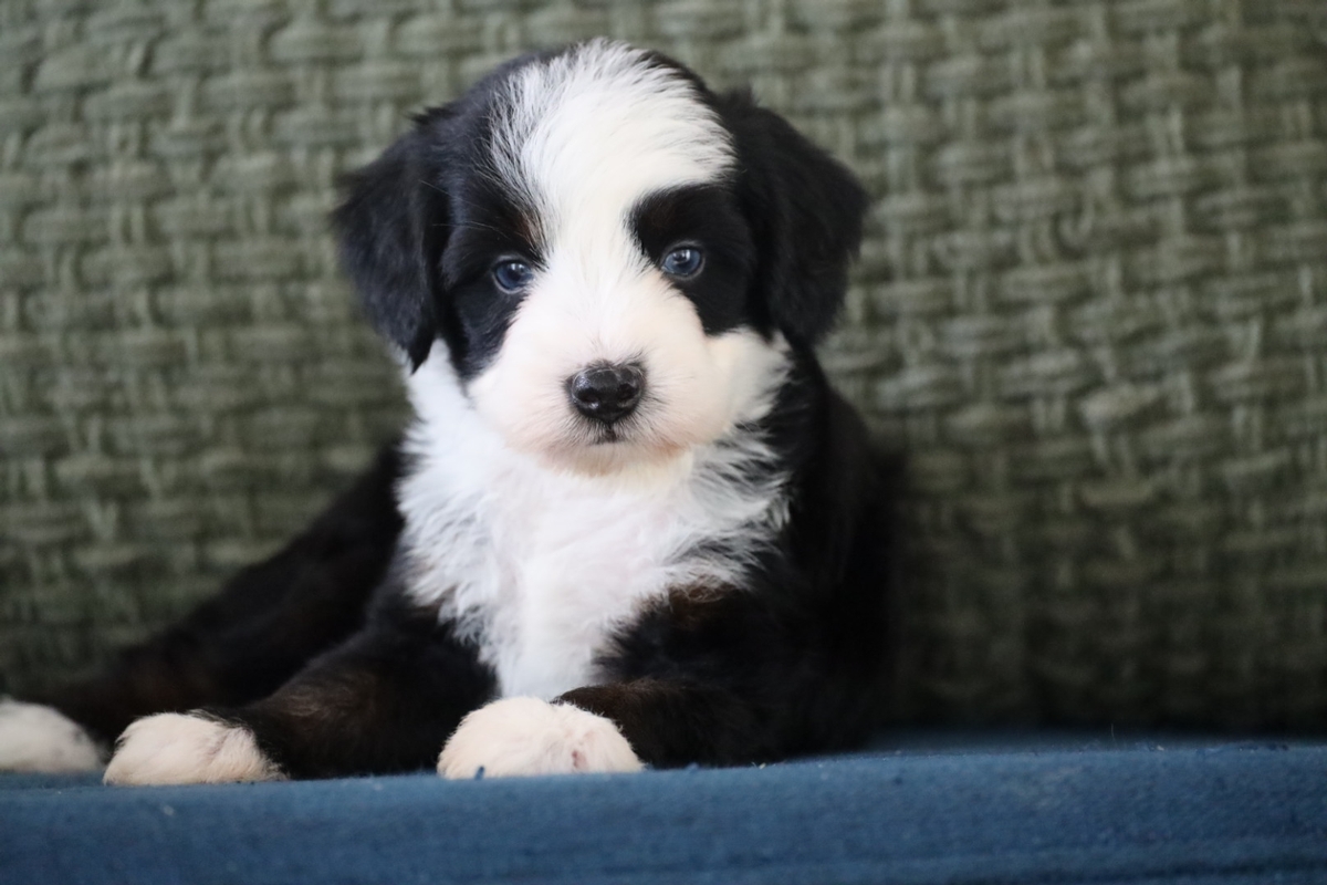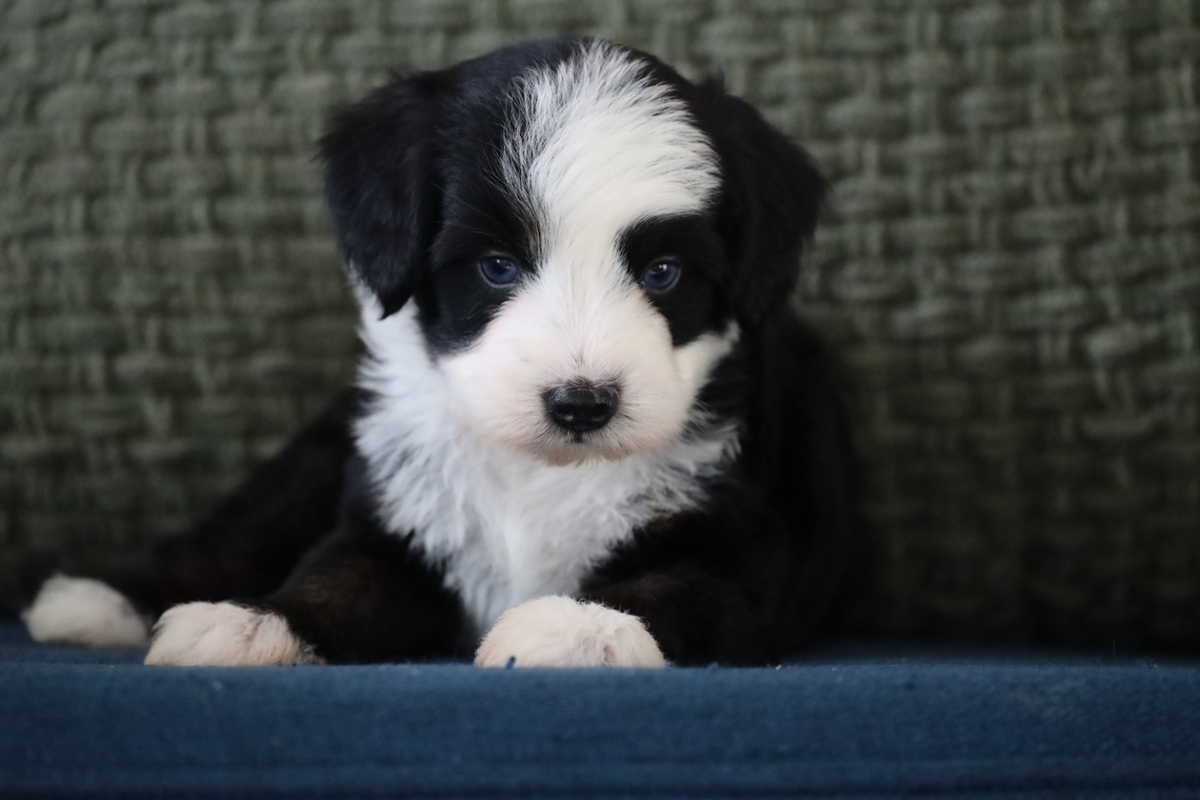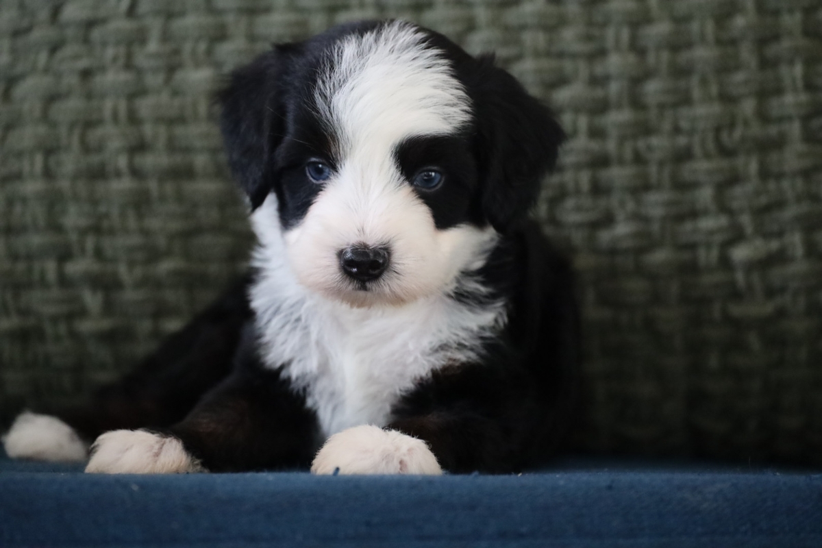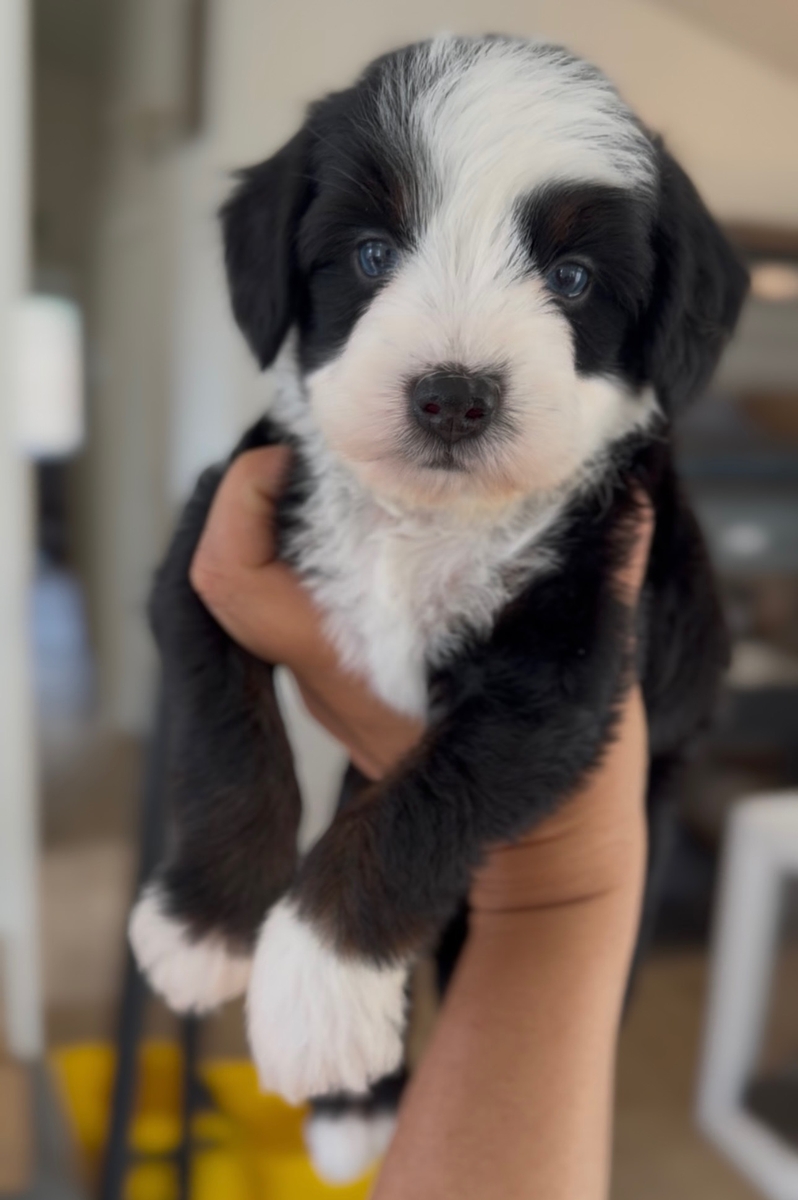Chevy is an absolutely adorable male tri-color Mini multigenerational Bernedoodle with two striking blue eyes that make him truly stand out. His classic tri-color markings paired with his bright, expressive gaze give him a look that’s both eye-catching and full of personality. Chevy has a soft, fully furnished, non-shedding coat and is expected to mature in the 25 lb range—an ideal size for families looking for a smaller companion with all the charm of a Bernedoodle.