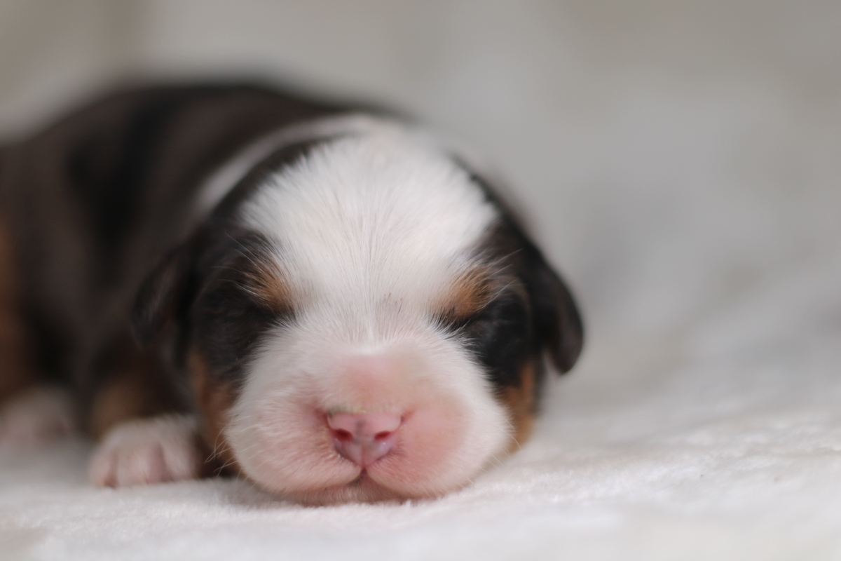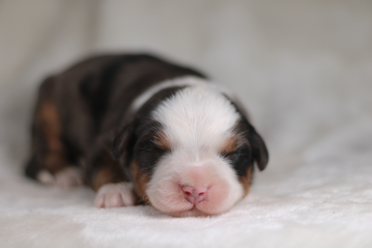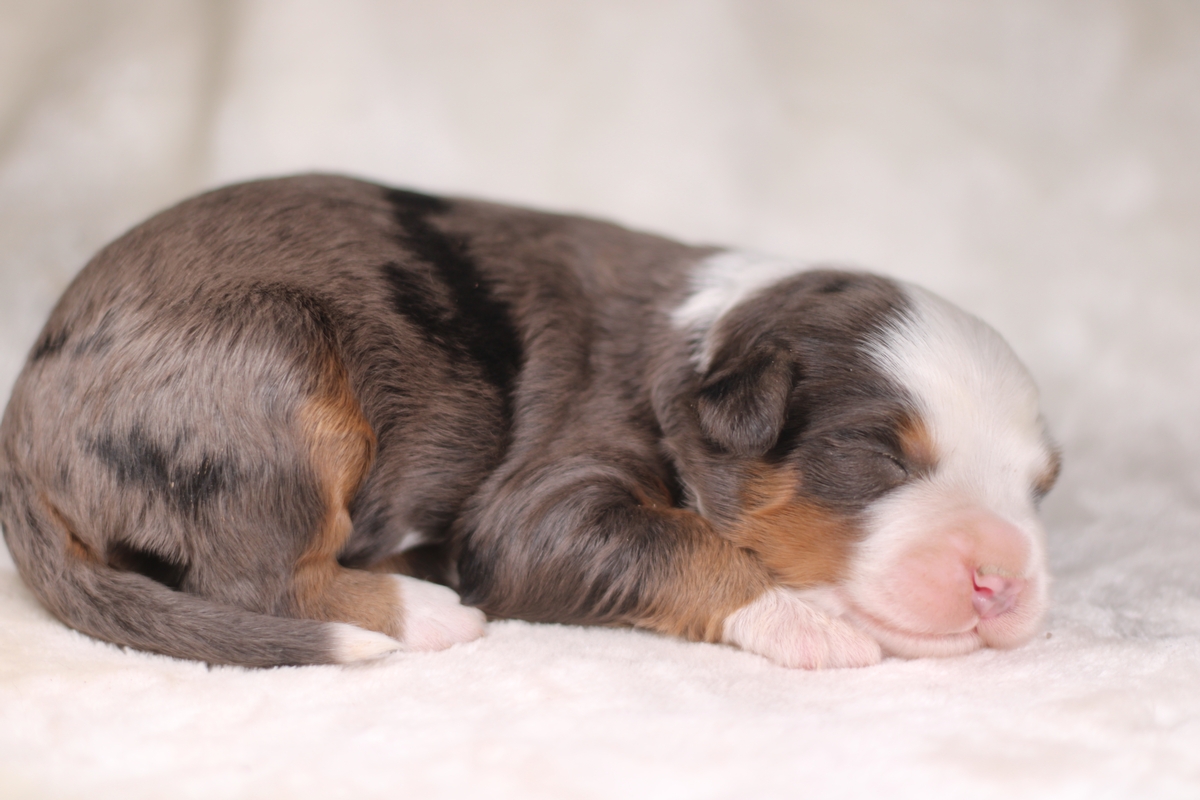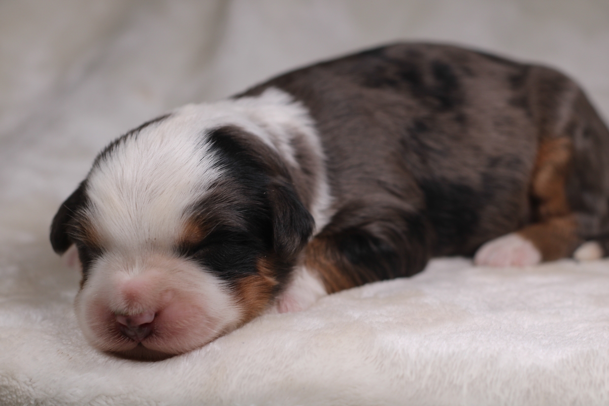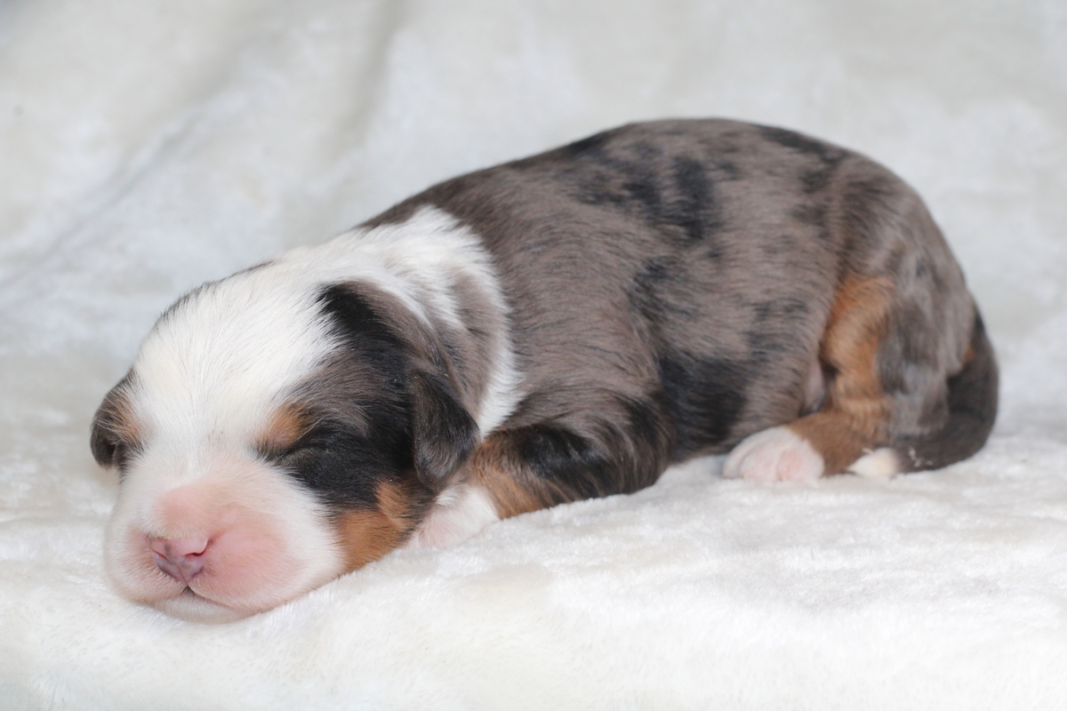 Meet Molly, our gorgeous blue merle female Bernedoodle. Born on September 13th, Molly has a loose wavy coat that is completely non-shedding and hypoallergenic. She is expected to mature in the 50–80 lb range, giving her a sturdy, well-balanced Bernedoodle build.