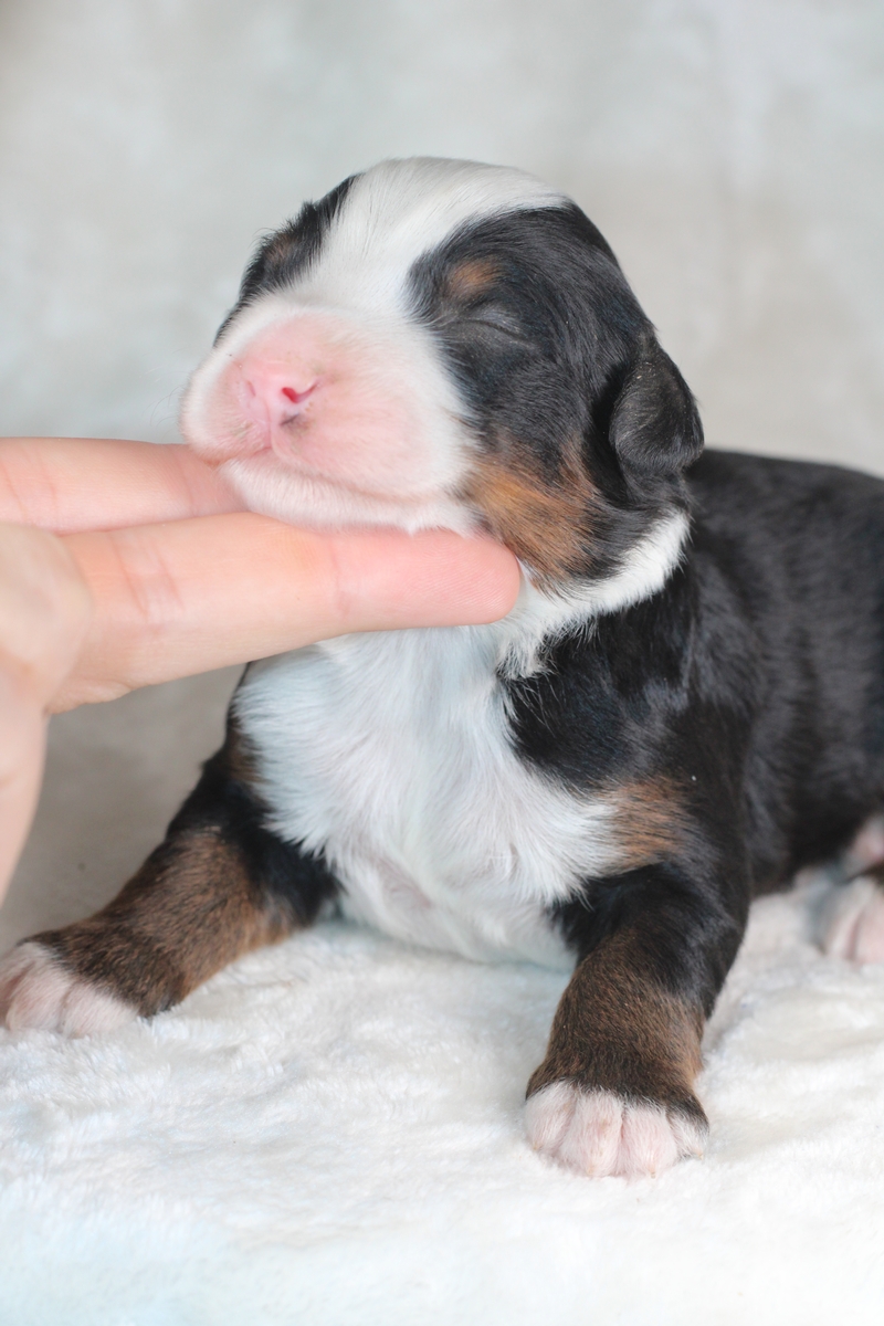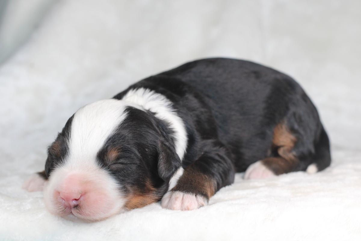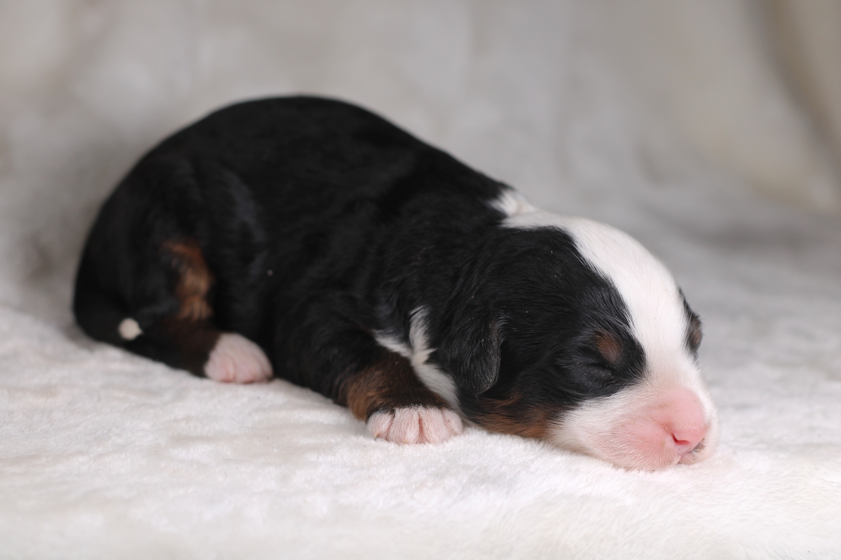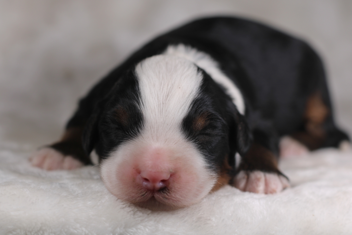Meet Mable, our beautiful black tri-color female Bernedoodle. Born on September 13th, Mable has a loose wavy coat that is completely non-shedding and hypoallergenic. She is expected to mature in the 50–80 lb range, giving her a wonderful sturdy size with classic Bernedoodle markings.