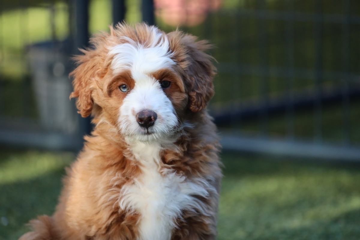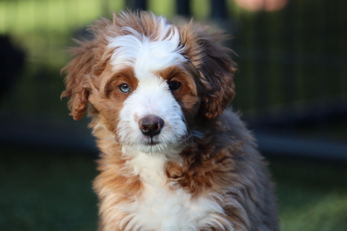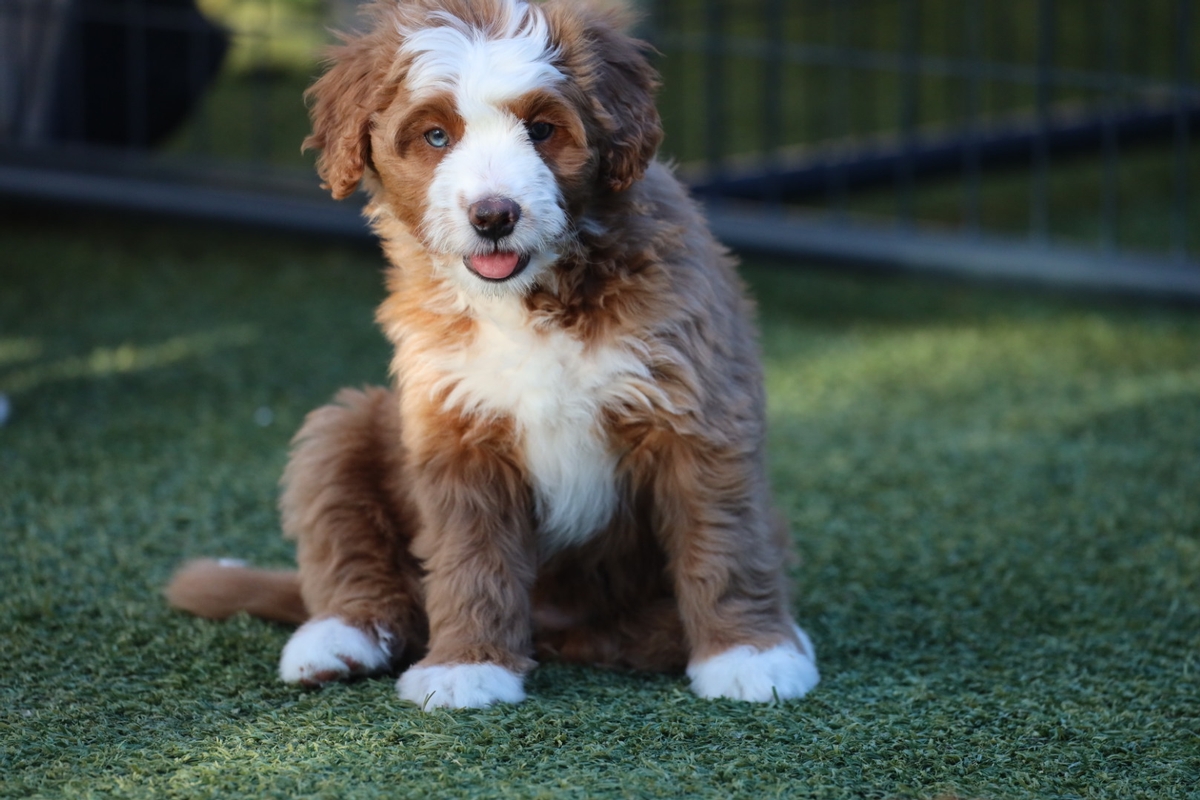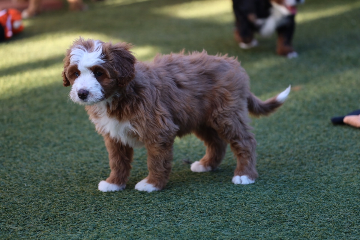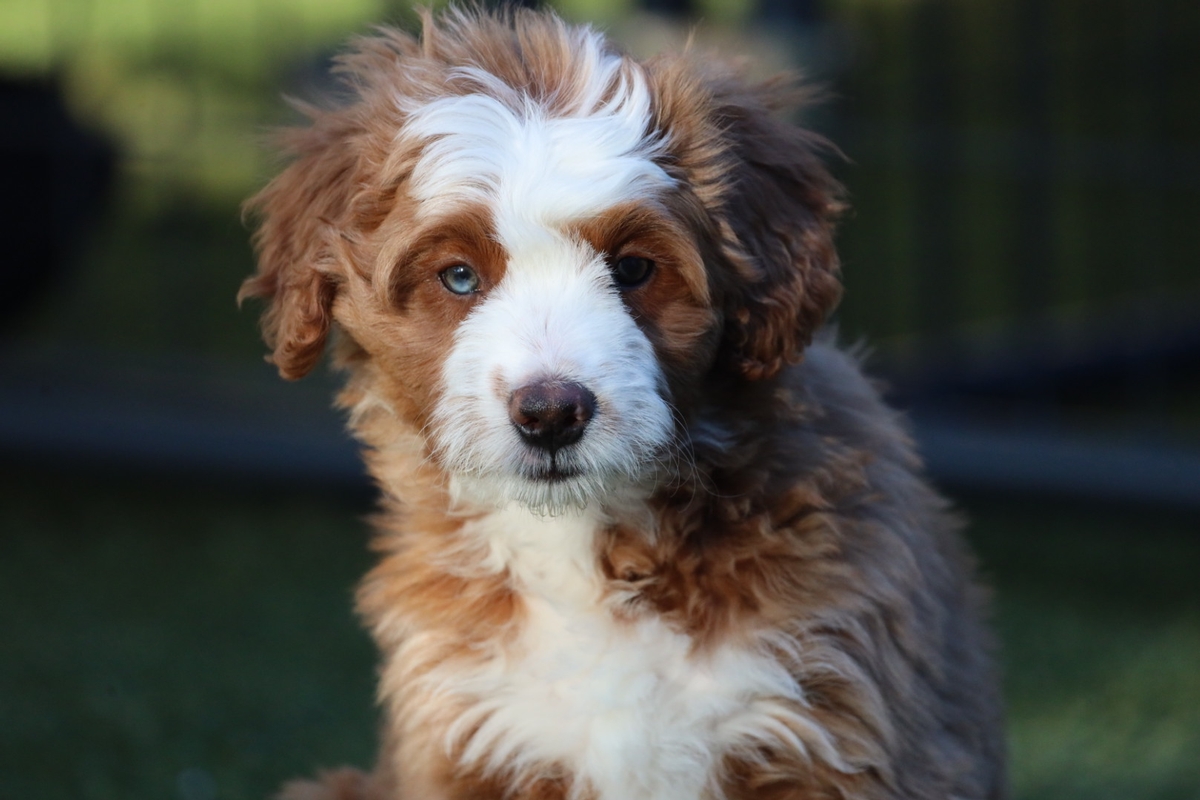 Meet Ruby, our stunning red and white multigenerational Mini Bernedoodle with a soft, loose wavy coat that’s completely non-shedding and hypoallergenic. Born on September 1st, she’s now ready to join her forever family. Ruby is the perfect blend of elegance and sweetness — her striking coloring and soulful eyes draw you in instantly, while her affectionate nature makes her an ideal companion for families, singles, or anyone looking for a loving, loyal friend.