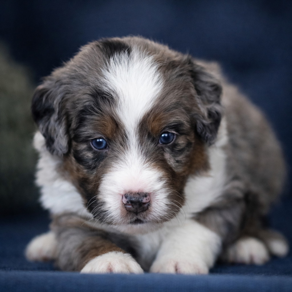 Toffee is a stunning blue-eyed tri-color female Mini Aussie Mountain Doodle with a beautifully furnished, low-to-non-shedding coat and a gentle, eye-catching expression. She is expected to mature in the 30-pound range, making her a perfect mid-size companion for families seeking an affectionate and easy-to-manage dog.