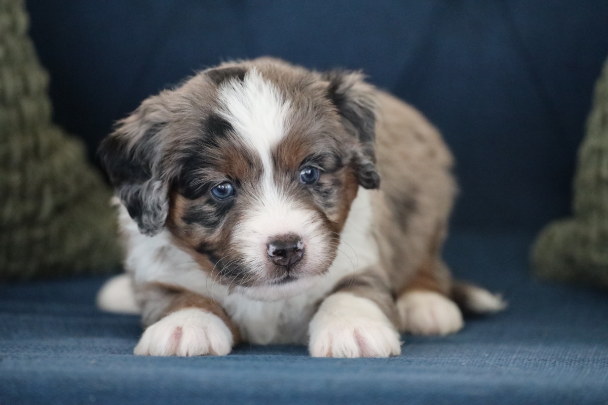 Snickers is a striking blue merle Mini Aussie Mountain Doodle with a furnished, low-to-non-shedding coat. His unique coloring and sweet expression make him truly eye-catching, and he is expected to mature in the 35-pound range, creating a perfect medium-size companion for an active, loving family.