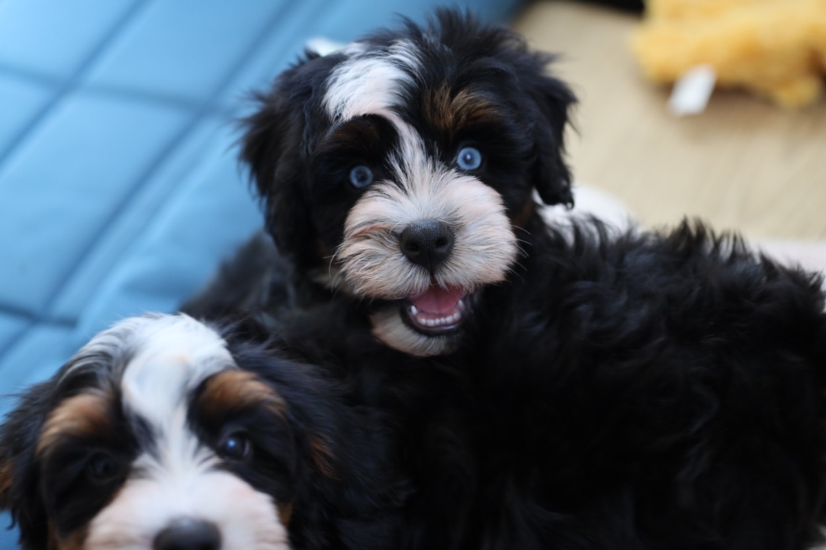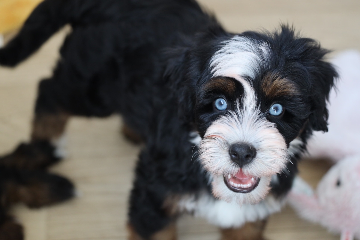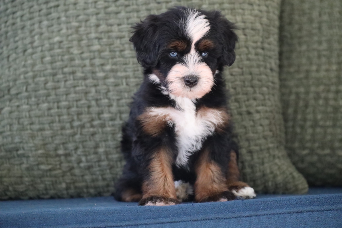 Toby is a striking male multigenerational Mini Bernedoodle with a beautiful tri-color coat and a captivating blue eye that makes him truly stand out. His soft, loose wavy, fully furnished coat is non-shedding, and his bright, expressive features reflect his playful and affectionate personality. Toby is expected to mature in a great companion size, making him a wonderful fit for families looking for a loving and eye-catching addition to their home.