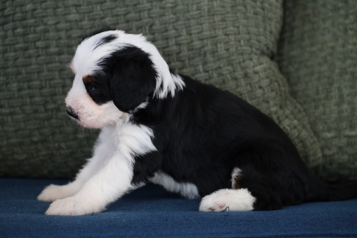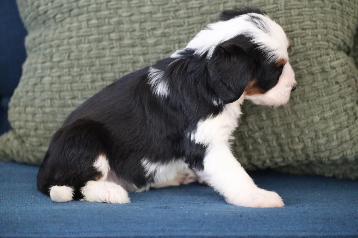 Wendy is a beautiful female Mini Bernedoodle with classic tri-color markings and warm brown eyes that give her the sweetest, most gentle expression. She has a soft, loose wavy coat that is fully furnished, non-shedding, and hypoallergenic—perfect for families looking for both beauty and low maintenance. Wendy is expected to mature in the 25 lb range, making her an ideal companion size for a variety of homes and lifestyles.